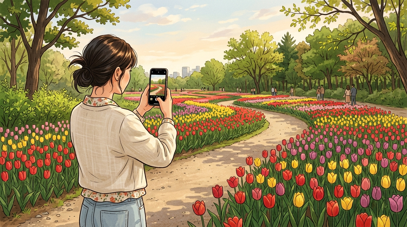 튤립 사진은 ‘색’만 생각하면 단조로워진다. 배경에 나무 줄기나 길의 곡선이 들어가면 이야기가 생긴다. 그래서 튤립 구역에서는 “낮은 앵글로 꽃을 크게, 뒤쪽에 사람은 흐리게”와 “허리 높이 앵글로 꽃+길+인물” 두 가지를 번갈아 찍어보면 결과물이 훨씬 다양해진다.